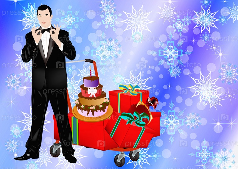 Мужчина в классическом смокинге с подарками на новогоднем фоне