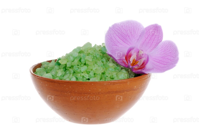 Соль для ванн и орхидея на белом фоне