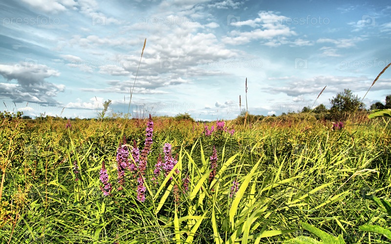Дикие сиреневые цветы на зеленом поле