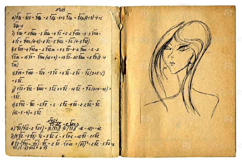 Старая исписанная тетрадь с рисунками