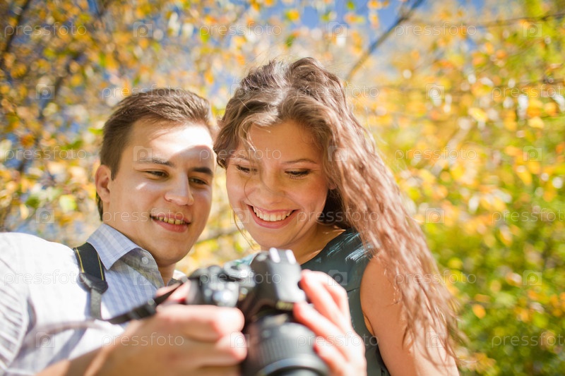 Счастливая молодая пара с фотокамерой в осеннем парке