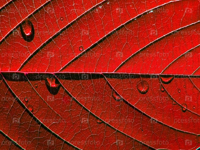 Красный лист дерева с каплями росы, фон