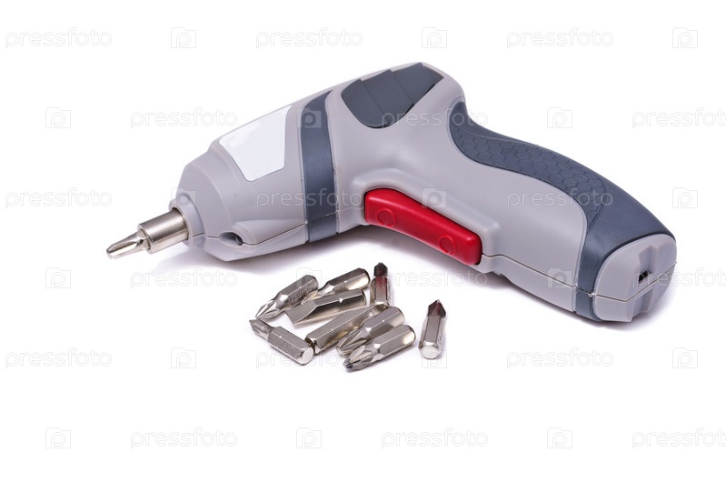 Электрическая отвертка с насадками на белом фоне