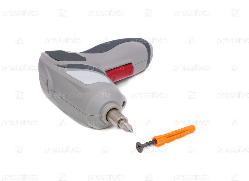 Электрическая отвертка и винт на белом фоне