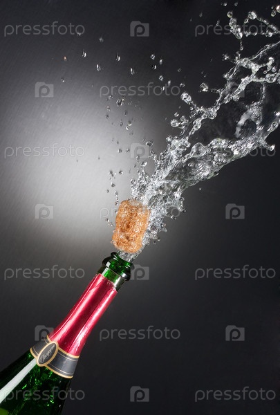 Бутылка шампанского с вылетающей пробкой и брызгами на черном фоне