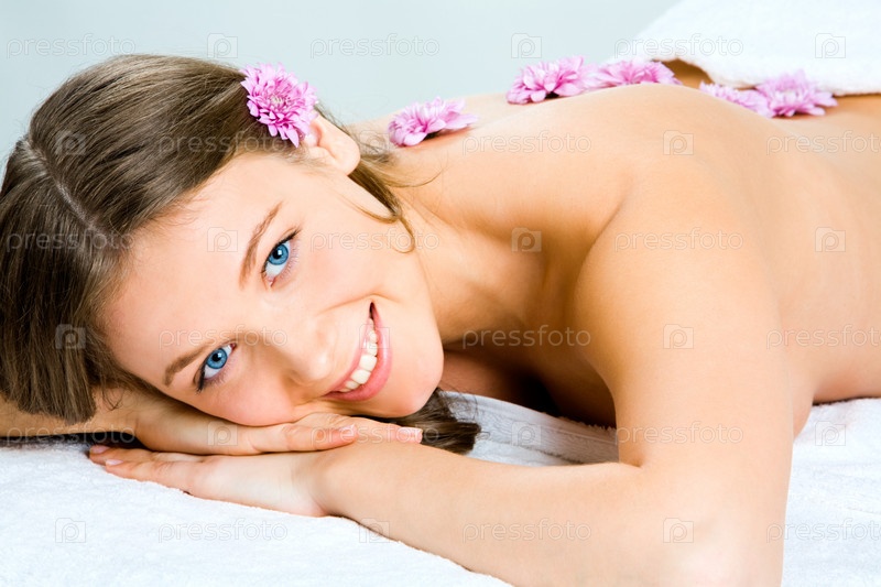 Горизонтальная фотография красивой девушки, лежащей с цветами на спине и наслаждающейся ароматерапией в гостиной