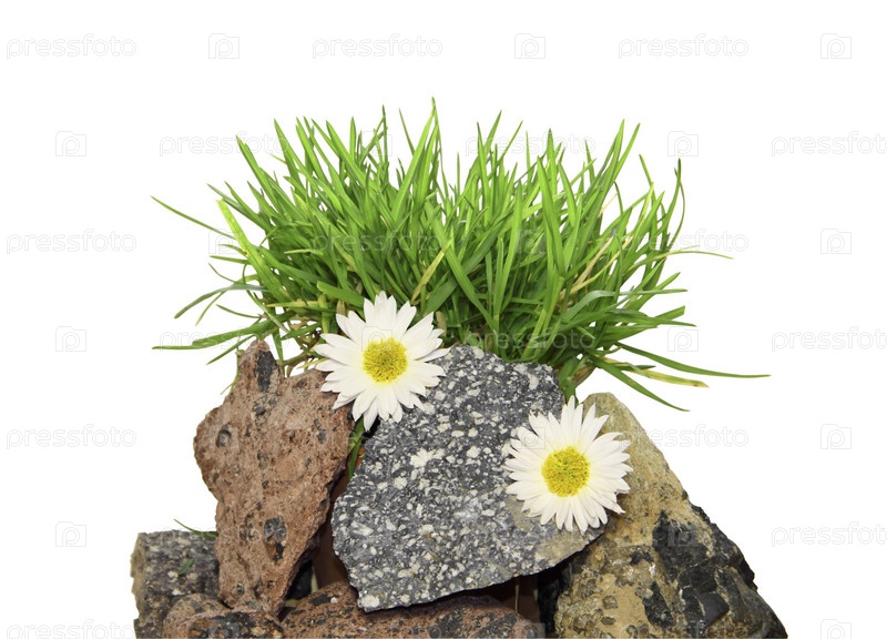 Зеленая трава на камнях и ромашки