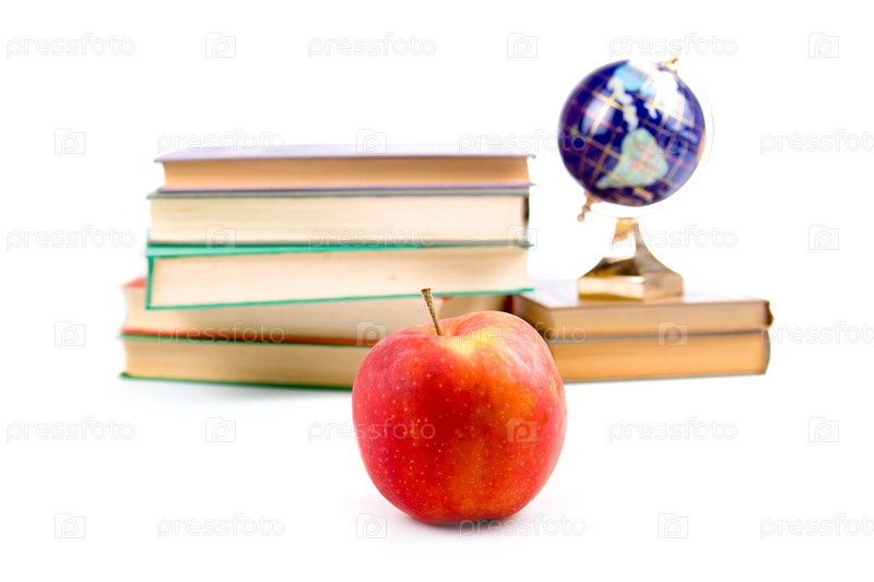 Яблоко, глобус и учебники, изолированные на белом фоне