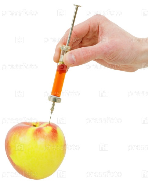 Рука со шприцем делает инъекцию в яблоко на белом фоне