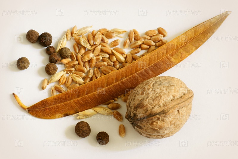 Пшеничное зерно, лист, черный перец и грецкий орех