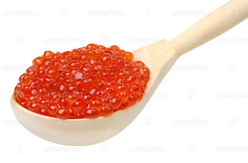 Красная икра в деревянной ложке на белом фоне