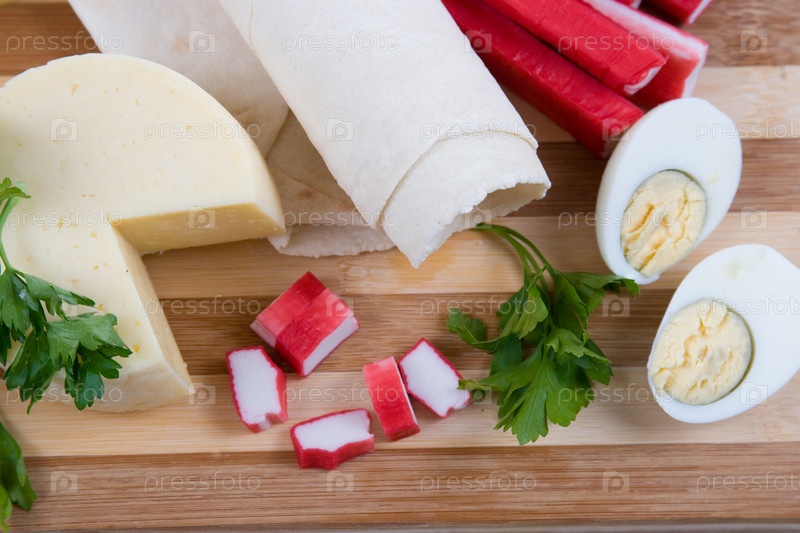 Крабовые палочки, вареные яйца, сыр, лаваш и зелень на кухонной доске