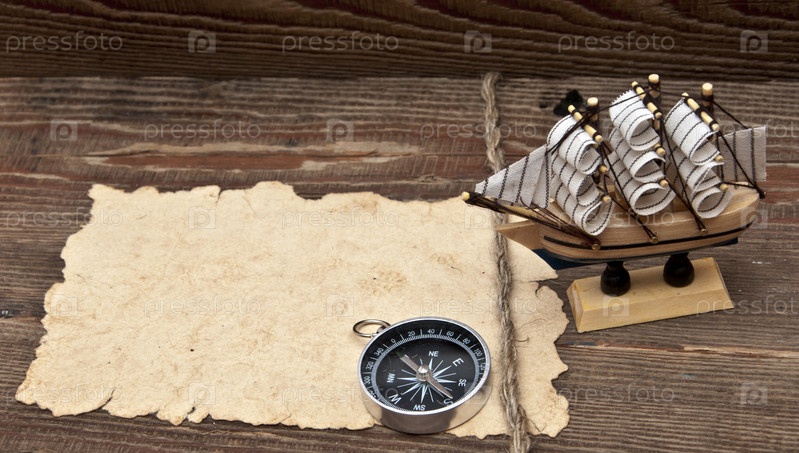 Старая бумага, компас, веревка и модель корабля на деревянной поверхности