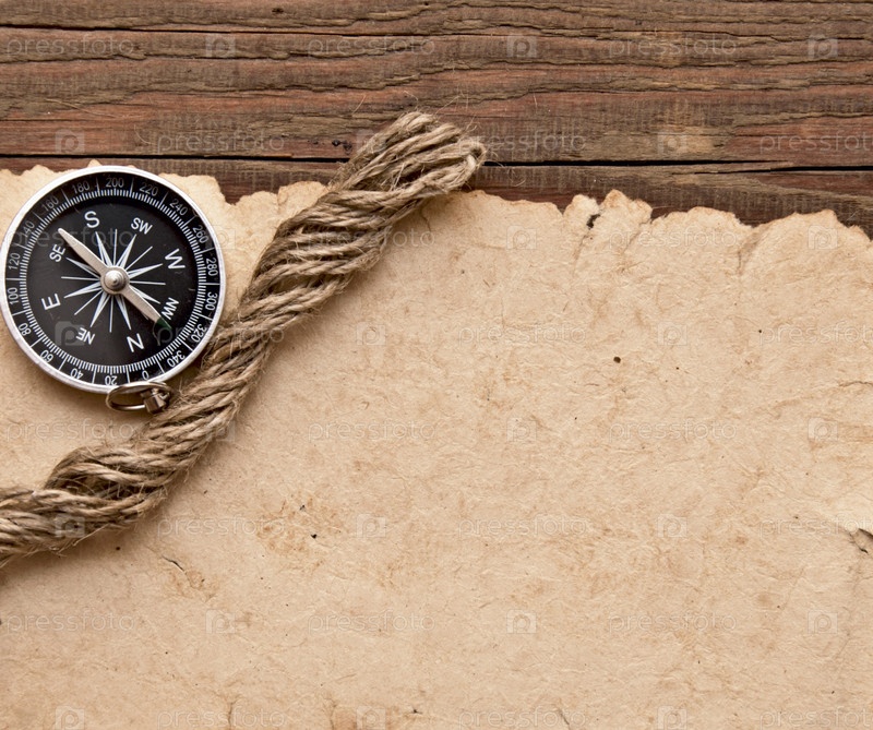 Старая бумага, компас и веревка на деревянной поверхности