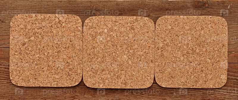 Ряд из трех пробковых досок на деревянной поверхности