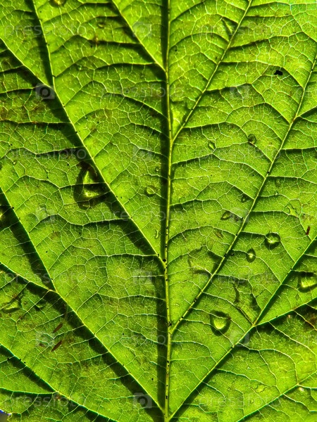 Текстура зеленого листа с каплями воды крупным планом