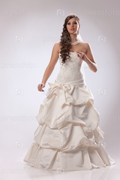 Молодая красивая брюнетка в модном свадебном платье