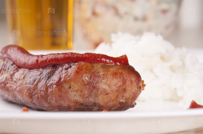 Рис и жареная колбаска с кетчупом