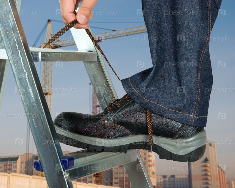 Строитель завязывает шнурки на ботинке на фоне здания