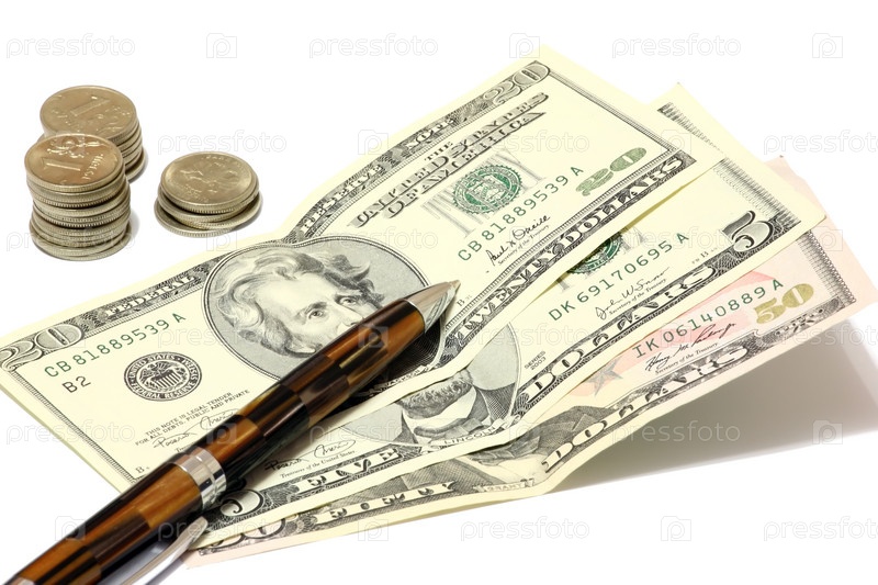 Доллары, монеты и ручка на белом фоне