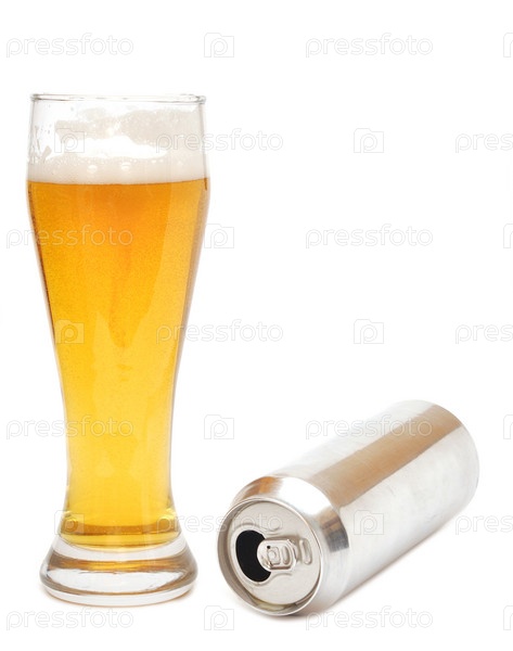 Стакан пива и пустая жестяная банка на белом фоне