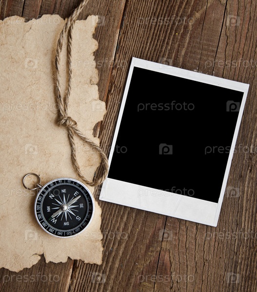 Старая бумага, компас, веревка и фотография на деревянной поверхности