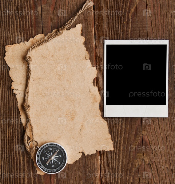 Старая бумага, компас, веревка и фотография на деревянной поверхности