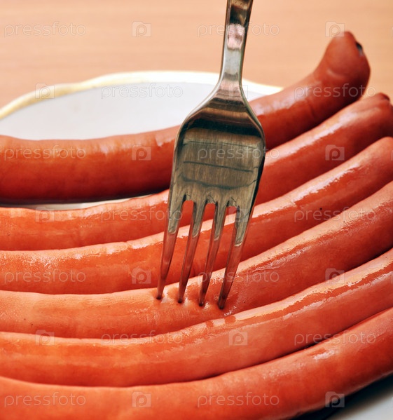 Вилка, воткнутая в сосиску на тарелке