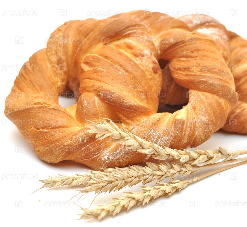 Сдоба и пшеничные колосья на белом фоне