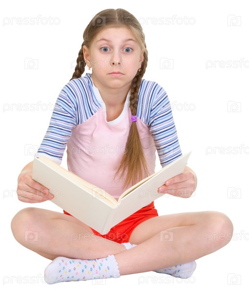 Удивленная девушка с книгой в руках на белом