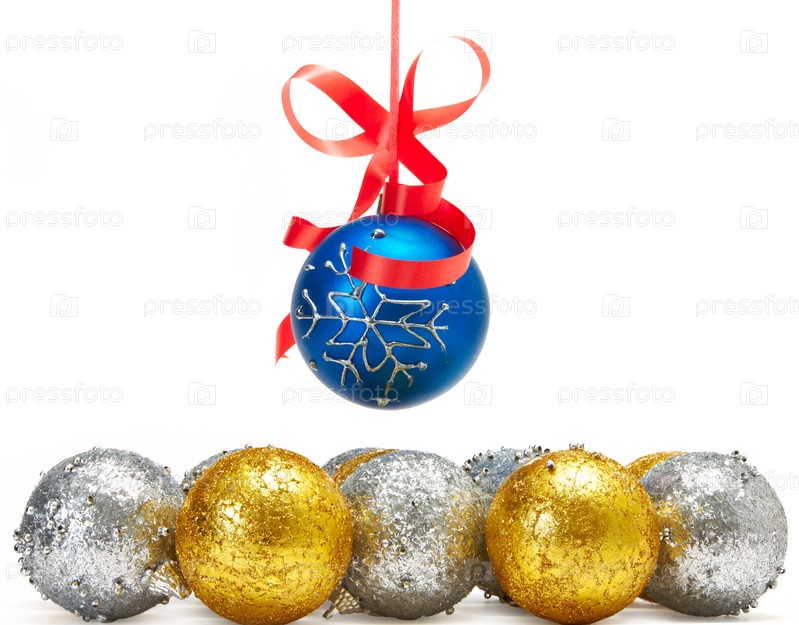 Синий новогодний шар с красной лентой висит над белыми и желтыми шарами на белом фоне