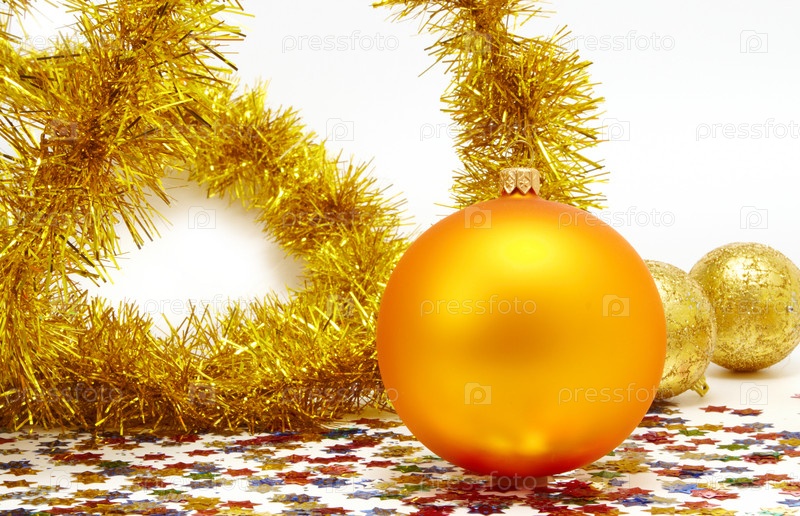 Желтые новогодние шары, мишура и разноцветные конфетти на белом фоне