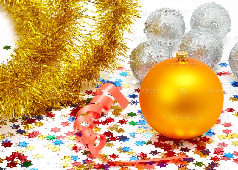 Новогодние шары, мишура, серпантин и разноцветные конфетти на белом фоне