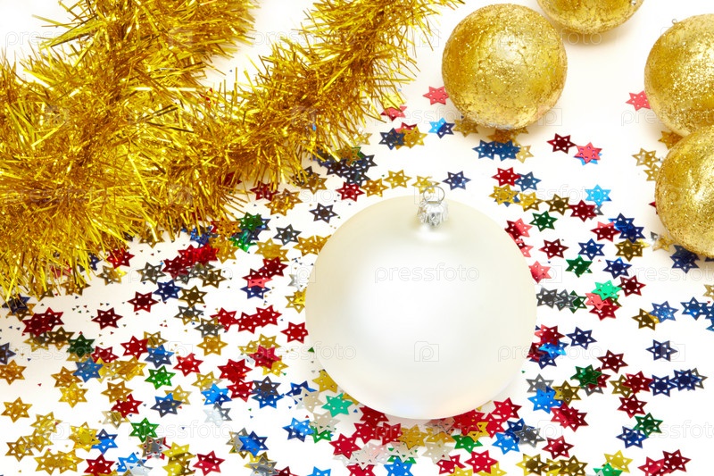 Новогодние шары, мишура и разноцветные конфетти на белом фоне