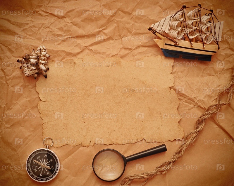 Модель корабля, лупа, компас и ракушка на старой бумаге