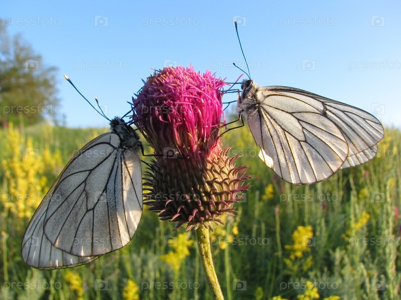 Две бабочки сидят на луговом цветке