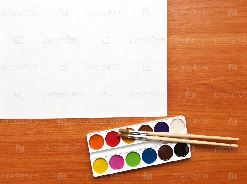 Акварельные краски, кисточки и чистый лист бумаги на столе