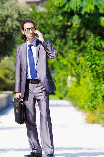 Бизнесмен с портфелем на открытом воздухе разговаривает по мобильному телефону