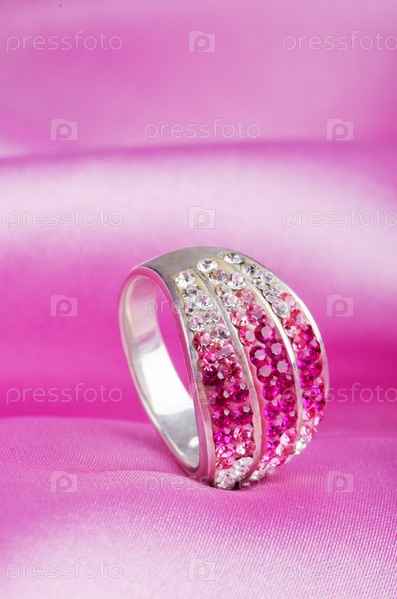 Кольцо с драгоценными камнями на фоне розового шелка