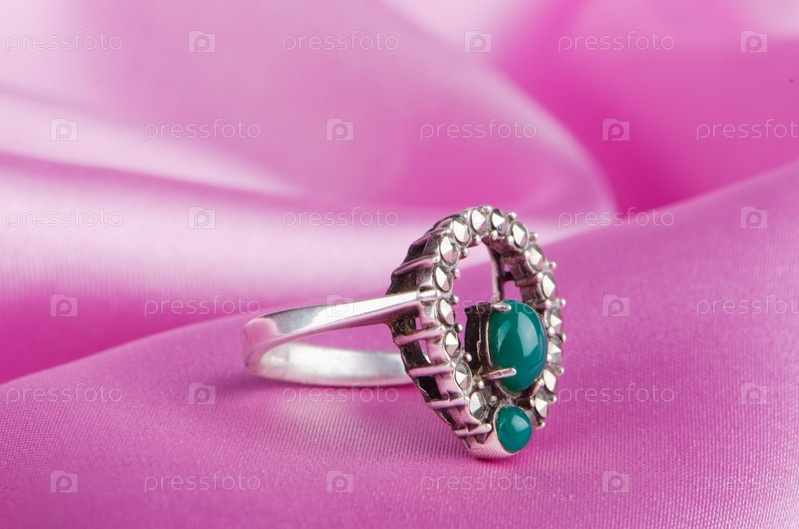 Кольцо с драгоценными камнями на фоне розового шелка