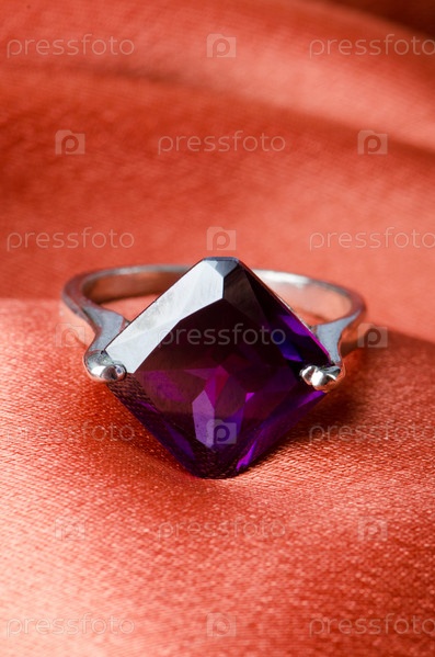 Кольцо с драгоценным камнем на фоне красного шелка