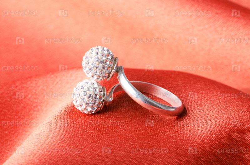 Кольцо с драгоценными камнями на фоне красного шелка
