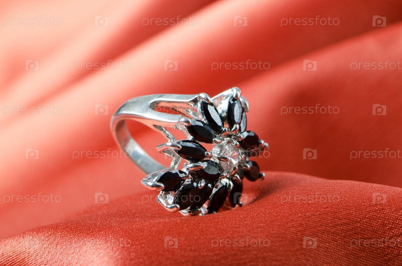 Кольцо с драгоценными камнями на фоне красного шелка