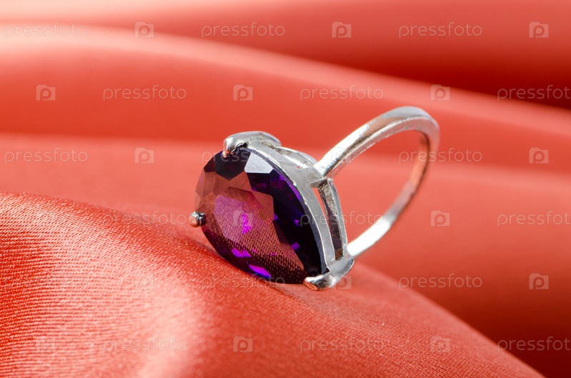 Кольцо с драгоценным камнем на фоне красного шелка