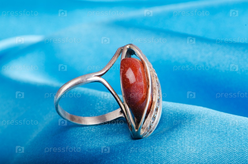 Кольцо с драгоценным камнем на фоне голубого шелка