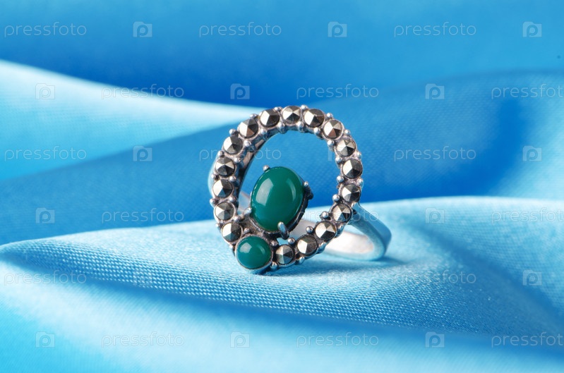Кольцо с драгоценными камнями на фоне голубого шелка