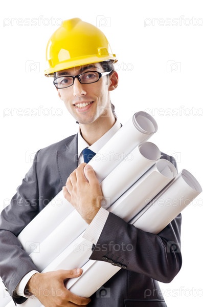 Молодой архитектор с чертежами на белом фоне