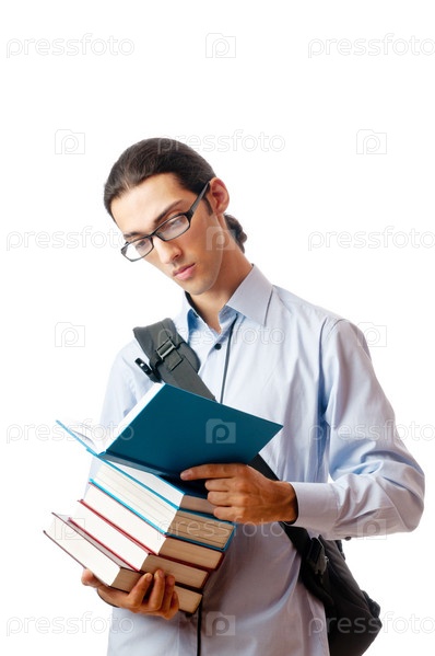 Студент с книгами на белом фоне