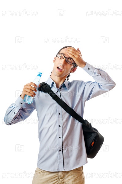Уставший студент с бутылкой воды на белом фоне