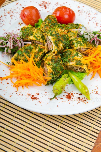 Шашлык в лаваше с овощами на тарелке